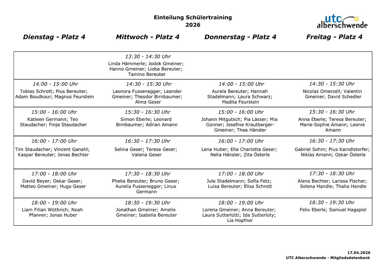 Einteilung Schülertraining 2026